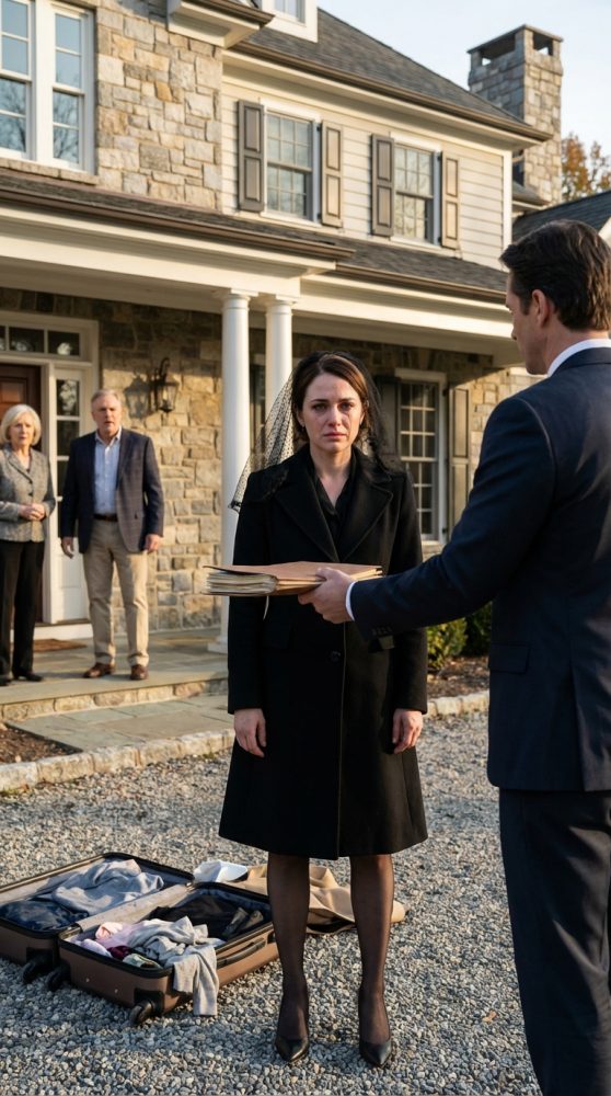 It hit the gravel hard enough to burst open, spilling black dresses, a pair of shoes, my toiletry bag, and the sweater I had worn to the hospital the night my husband died. I stood there in the driveway, still in mourning black, staring at my life scattered beneath the same oak tree where Daniel and I used to drink coffee on Sunday mornings. Behind me, the front door slammed, and my brother-in-law, Trevor, came down the steps like a man finishing a chore.