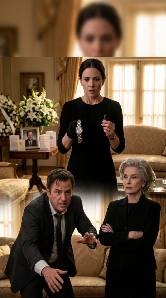 His tone was too fast, too sharp, stripped of all the fake mourning politeness he had walked in with. I straightened slowly, clutching the key in one hand and the damaged watch in the other.