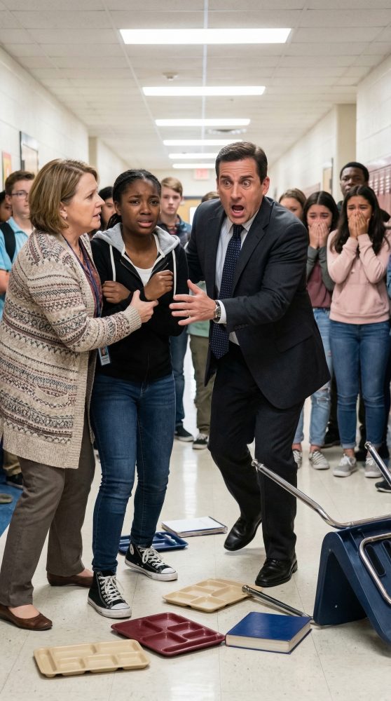 When I turned into the hallway, the scene in front of me made my stomach drop. A teacher—later I’d learn her name was Ms. Kellerman—had one hand locked around a boy’s arm and the other shoved against his shoulder. He couldn’t have been older than twelve. Desks from a nearby classroom had been knocked aside. A lunch tray lay upside down, milk spreading across the tile. Students were pressed against the walls, crying, yelling, recording on their phones. And there, frozen near the doorway, was Ava.
