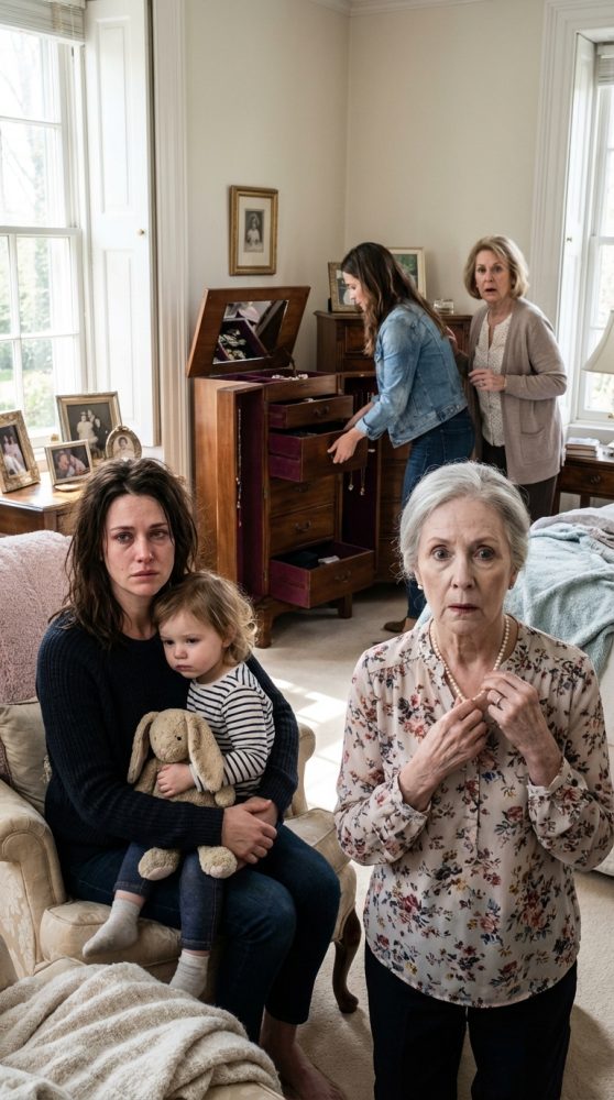The first thing I saw was my jewelry cabinet pulled away from the wall, its velvet-lined drawers hanging open like torn pages. My late husband’s aunt, Carol, had one of my bracelets looped over her fingers. My sister-in-law, Jenna, was standing at my dresser with a jewelry box open in her lap. And my mother-in-law, Judith, was at the center of the room, directing the chaos like she was overseeing movers instead of robbing a widow.