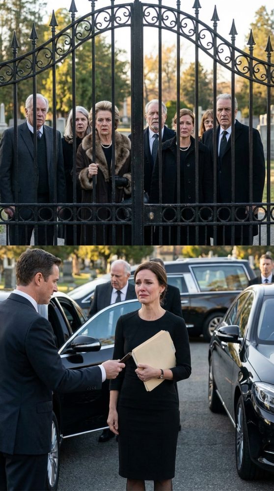Diane stood just inside the cemetery gate with one hand pressed to the bars, her face pale and furious. Cole stepped forward like he wanted to block the newcomers, but the woman leading the group—tall, composed, maybe in her early forties—didn’t even slow down. She held out a leather folder toward me and introduced herself.
