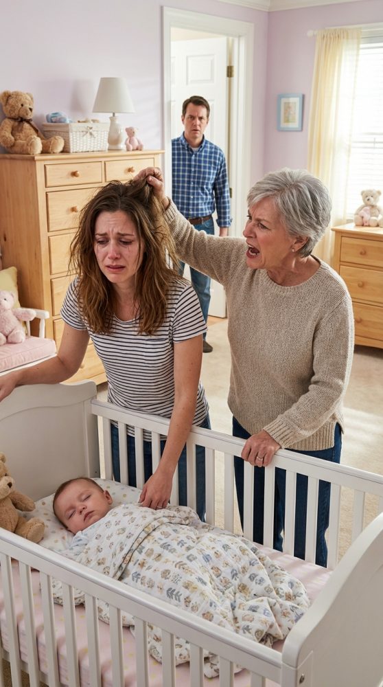 Lily had one hand on the bottle warmer and the other on the crib rail, probably trying not to wake him. My mother, Denise, stood behind her in the nursery with the kind of rigid posture that always meant trouble, though I had spent years calling it “strong opinions.” Lily said something too softly for the camera to catch. My mother stepped closer, hissed that sentence, and then fisted a handful of Lily’s hair so fast my wife gasped instead of screamed.