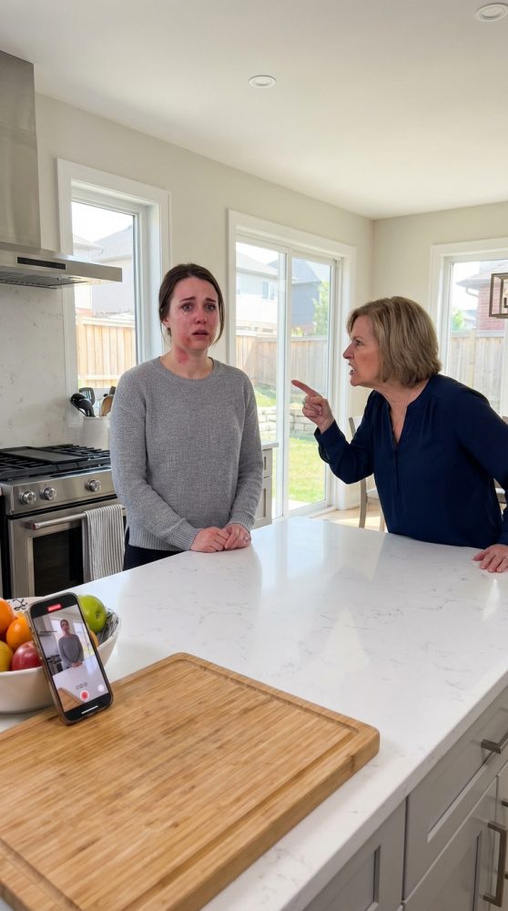 The first day I checked the footage, I sat in my office parking lot with my phone in my hand, expecting to see petty arguments over dishes or laundry. Instead, I saw Emily standing by the kitchen counter with her hands clasped in front of her while my mother paced the room like she owned every inch of it. She was the only one yelling. Emily barely spoke. My mother pointed at her face and snapped, “You think silence makes you innocent? You’ve turned my son against his own family.” Emily quietly said, “I haven’t done anything.” That only made my mother louder.