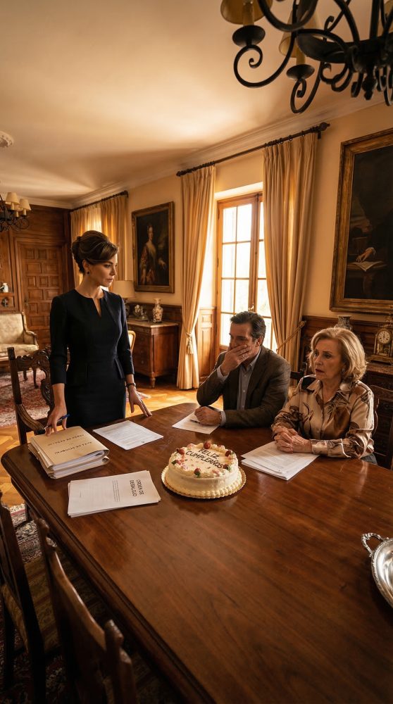 Me llamo Lucía Navarro, tengo treinta y siete años y el día que cumplí años pensé que iba a apagar velas en mi propia casa, con mi esposo a mi lado y la tranquilidad de haber levantado una empresa desde cero. En lugar de eso, me encontré sentada frente a la mesa del comedor viendo dos sobres manila, la firma de un abogado en la esquina y la sonrisa helada de mi suegra, Carmen Rivas, como si llevara semanas ensayando ese momento.