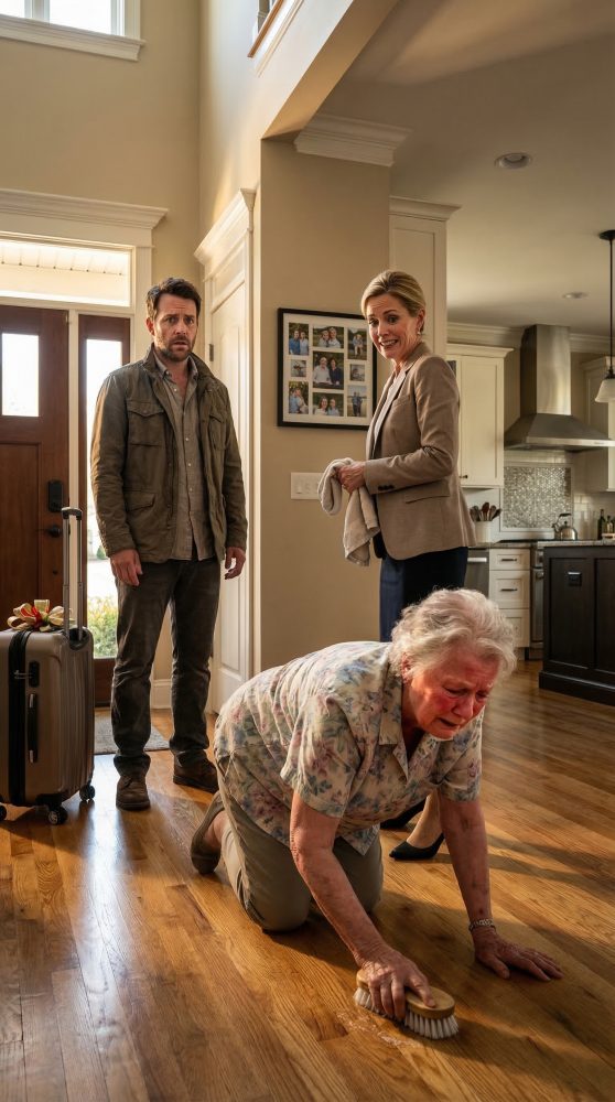 For a second, I honestly thought I had misunderstood. My mind searched for another explanation, something harmless, something normal. But when I moved closer, I saw my seventy-two-year-old mother on her knees in the kitchen, one hand pressed against the tile for balance, the other dragging a wet rag across the floor. A plastic bucket sat beside her. Her shoulders trembled. Olivia stood over her in yoga pants and a white sweater, arms crossed, watching like she was supervising hired help.