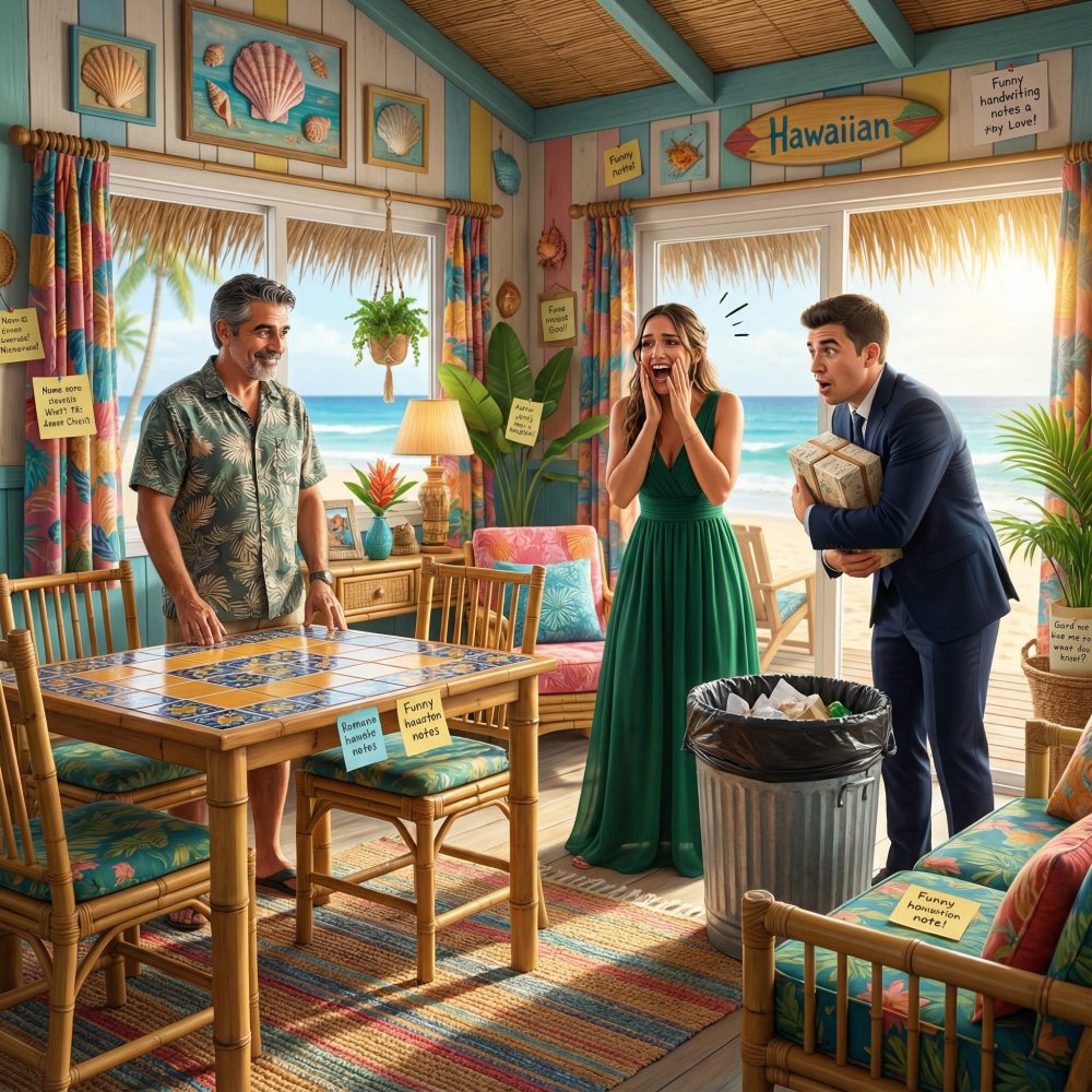 El “secreto” que había preparado no era algo sobrenatural, ni peligroso, pero sí totalmente inesperado. Había decorado la cocina con un estilo muy particular, mezclando arte local con elementos de humor que solo un verdadero amante de Hawái podría entender. Sobre la mesa, había un mini altar de conchas marinas con pequeñas figuras de surfistas, y cada cajón estaba etiquetado con notas graciosas que contaban historias inventadas de “fantasmas del mar” y leyendas locales, pero de manera tan divertida que nadie podría sentir miedo.