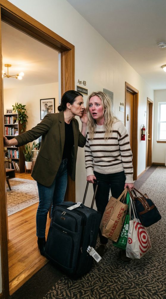 Vanessa froze in the hallway, one hand still gripping the handle of her suitcase.