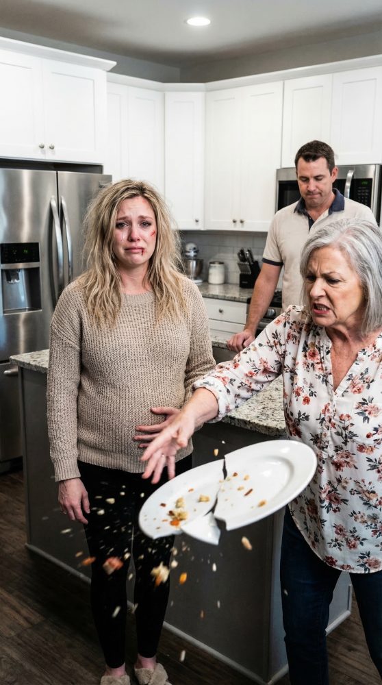Un segundo estaba junto a la estufa, intentando soportar el dolor sordo en la espalda baja, y al siguiente, la cerámica y la salsa caliente explotaron sobre mi mejilla. El borde del plato me golpeó la boca con tanta fuerza que me partió el labio. Probé la sangre incluso antes de entender lo que había pasado.