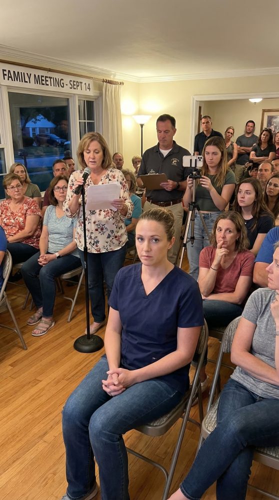 When I walked into my parents’ living room that evening, I knew something was wrong immediately. The furniture had been pushed aside and rows of folding chairs filled the room like a small auditorium. Around forty people were sitting there—neighbors, church friends, cousins, even a few people from my hospital. At the front stood a microphone and a banner that read: “We love you enough to tell the truth.”