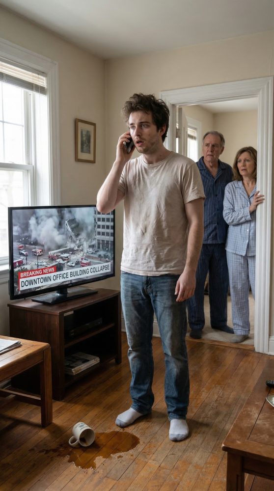 I turned on the TV just as the red banner flashed across the screen: PARTIAL BUILDING COLLAPSE DOWNTOWN. The helicopter shot showed my office surrounded by police cars, fire trucks, and a cloud of gray dust pouring into the street.