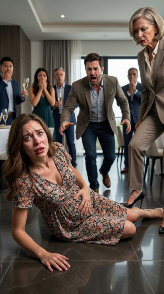 The air ripped out of me. I crashed to the tile, cheek against cold stone, a metallic taste blooming in my mouth. The room erupted—chairs screeching, someone screaming, “Call 911!” Ethan dropped beside me, shaking. “Mom! What did you do?” he yelled.