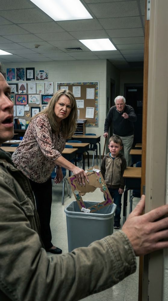 Yo estaba de pie en la puerta del aula 12 de la Primaria Maple Ridge, con un montón de hojas de asistencia en las manos, cuando vi a la señora Elvira Kane inclinarse sobre el bote de basura junto a su escritorio y arrojar dentro un pequeño marco hecho a mano como si le diera asco. El marco estaba hecho de cartón pintado, pegado de forma un poco torcida, con hilo amarillo alrededor de los bordes. En el centro había una fotografía de un niño de pie entre sus padres.